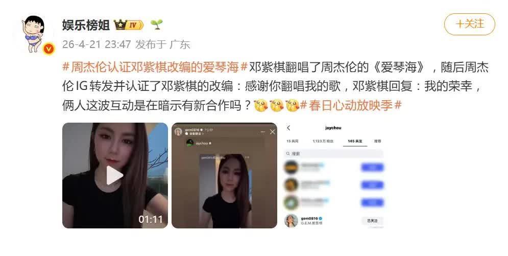 4月21日,乐坛上演了一波“神仙互动”。邓紫棋在社交平台发布视频,翻唱并亲自改编了周杰伦的经典歌曲《爱琴海》,随后竟火速获得了原唱周杰伦本人的亲自转发与留言认证。这波操作瞬间点燃网络,让全网对两位华语乐坛顶级唱作人的合作期待值直接拉满。