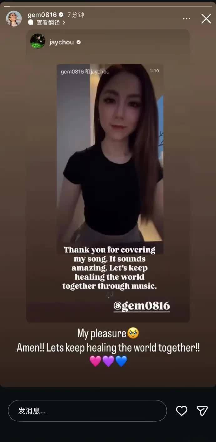 然而,真正让事件升级的,是周杰伦随后的反应。当天,周杰伦便通过个人Instagram转发了邓紫棋的翻唱视频,并热情留言:“感谢翻唱,听起来太棒了!让我们一起用音乐治愈世界。”邓紫棋也迅速回应:“我的荣幸!让我们一起治愈世界。”这番高规格的“双向奔赴”式互动,在粉丝圈里无疑投下了一颗重磅炸弹。